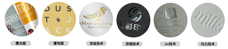 三、燙金、燙銀:燙金一種常見的印刷裝飾工藝,亦作" 燙印 ",其制作原理是將金屬印版加熱,施箔,在印刷品上壓印出金色文字或圖案。燙銀和燙金差不多,只是所選用的材料不同,燙金會呈現(xiàn)金色光澤,而燙銀則會呈現(xiàn)銀色光澤。燙金、燙銀的特點:圖案清晰、美觀,色彩鮮艷奪目,常被用于logo印刷。